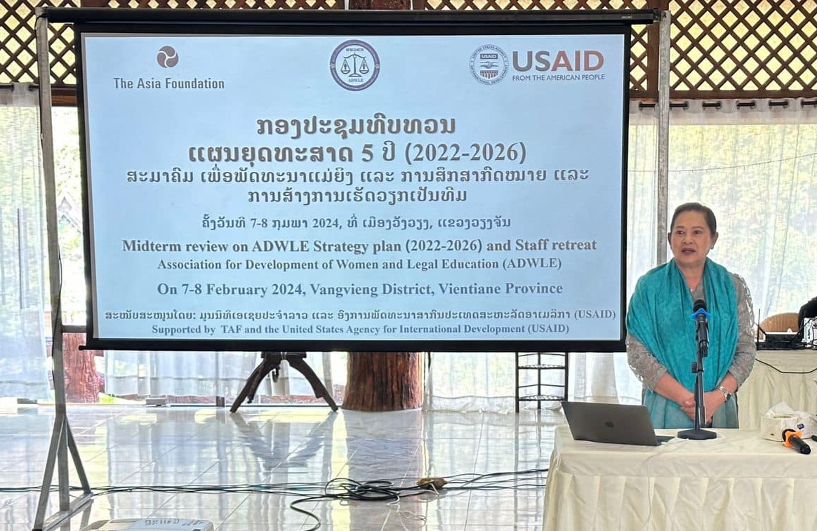 The Association for Development of Women and Legal Education (ADWLE) held a midterm review of its five-year strategic plan (2022-2026) and strengthened good teamwork skills for staff on 7-9 February 2024 at Champathong Resort, Vang Vieng District, Vientiane Province. During the 3-day meeting, there was enthusiastic sharing and learning among ADWLE staff and members of executive and advisory boards that led to fruitful and meaningful reflection on the results of the implementation of the strategic plan during the first 2 years and planning way ahead from 2024-2026 to meet the set indicators and objectives. This meeting was supported by The Asia Foundation (TAF) through the legal aid program supported by the United States Agency for International Development (USAID)
